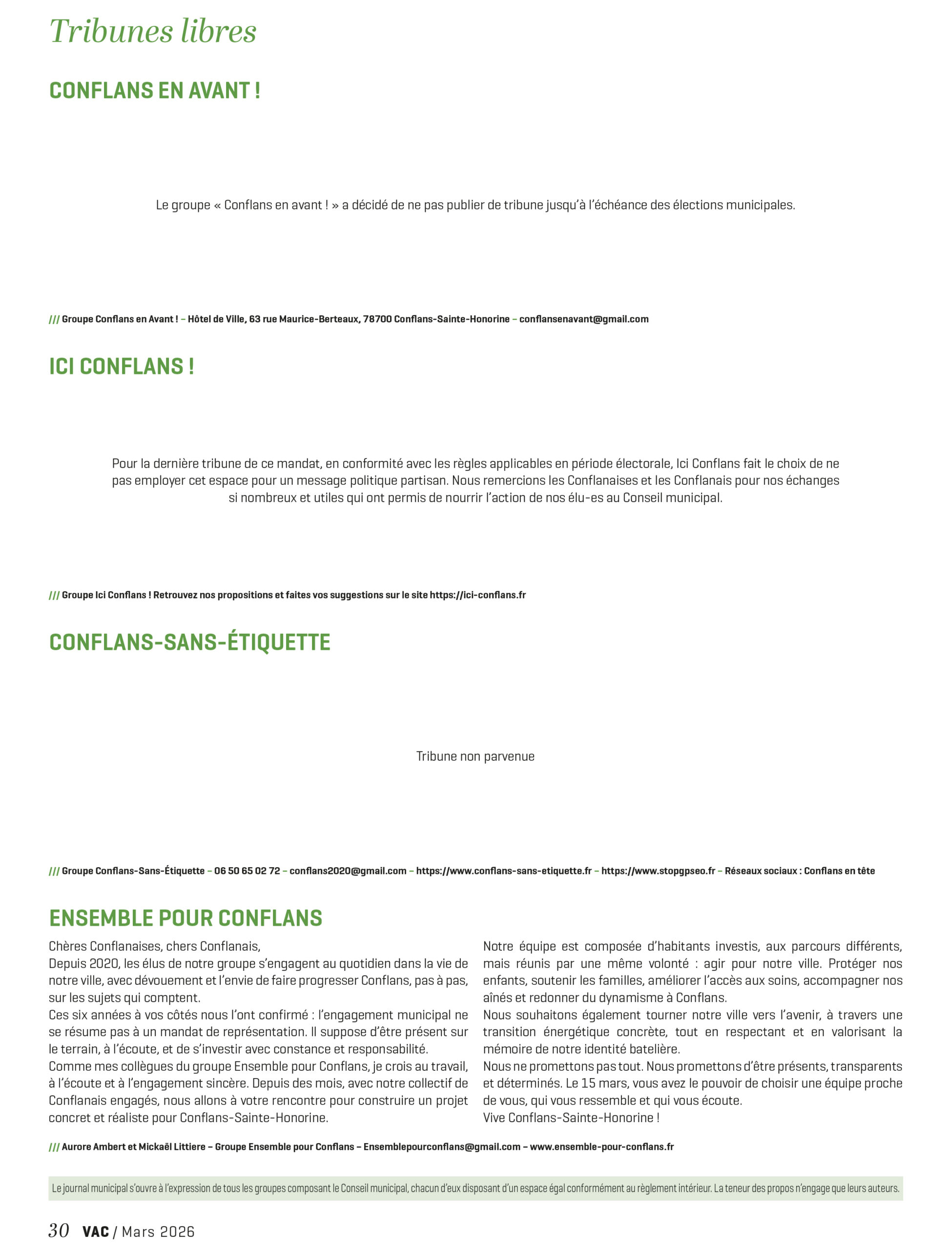 Retrouvez les dernières tribunes libres des groupes du Conseil municipal parues dans le magazine municipal, le Vivre à Conflans (VAC) : janvier 2026 / février 2026 / mars 2026