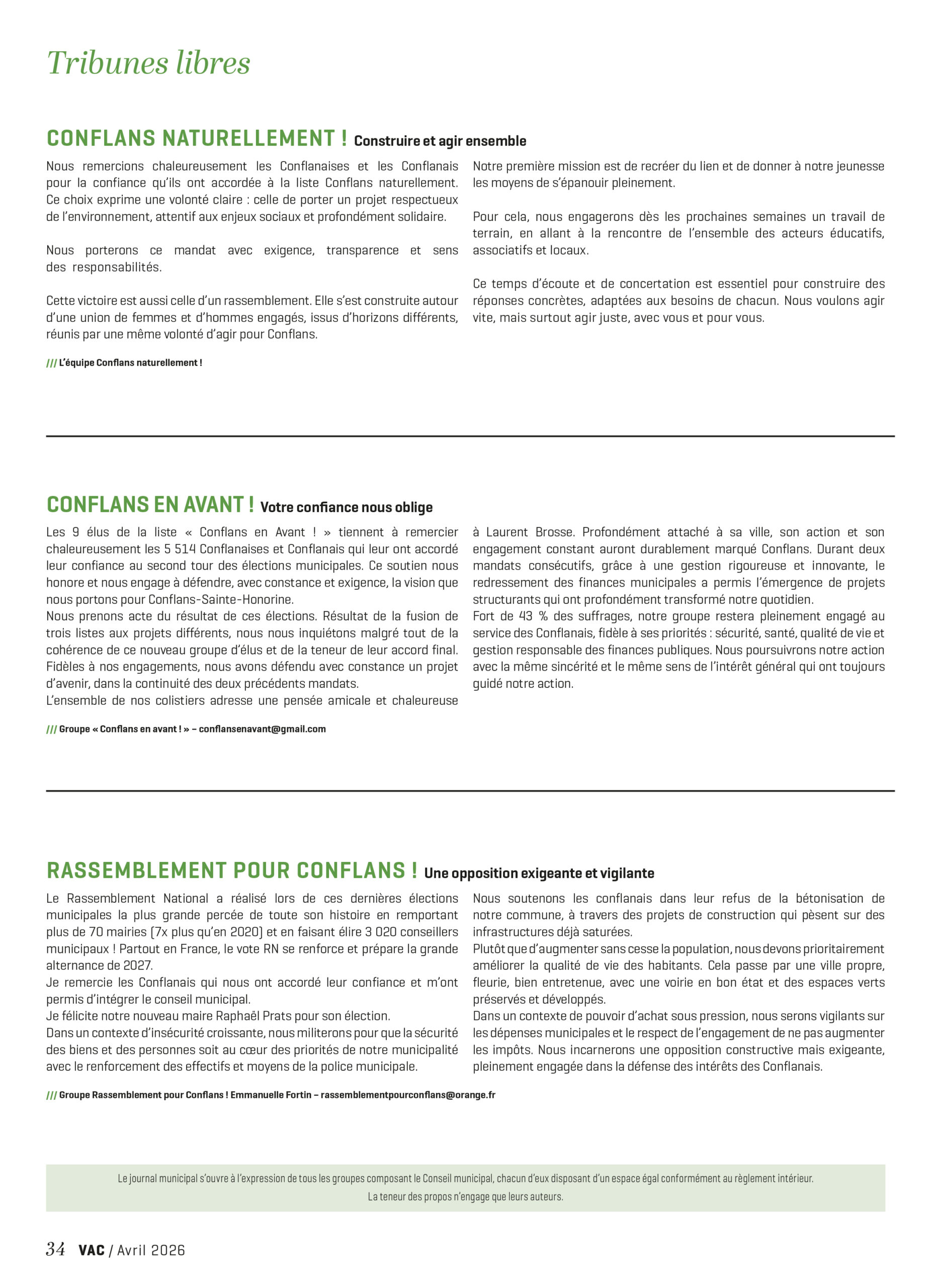 Retrouvez les dernières tribunes libres des groupes du Conseil municipal parues dans le magazine municipal, le Vivre à Conflans (VAC) : février 2026 / mars 2026 / avril 2026